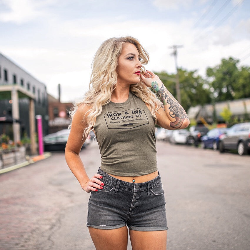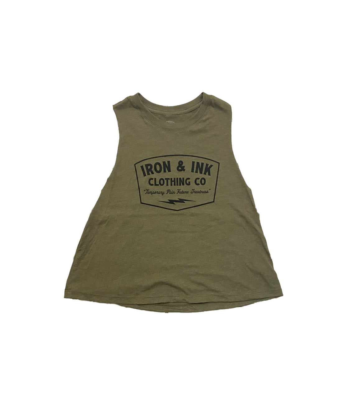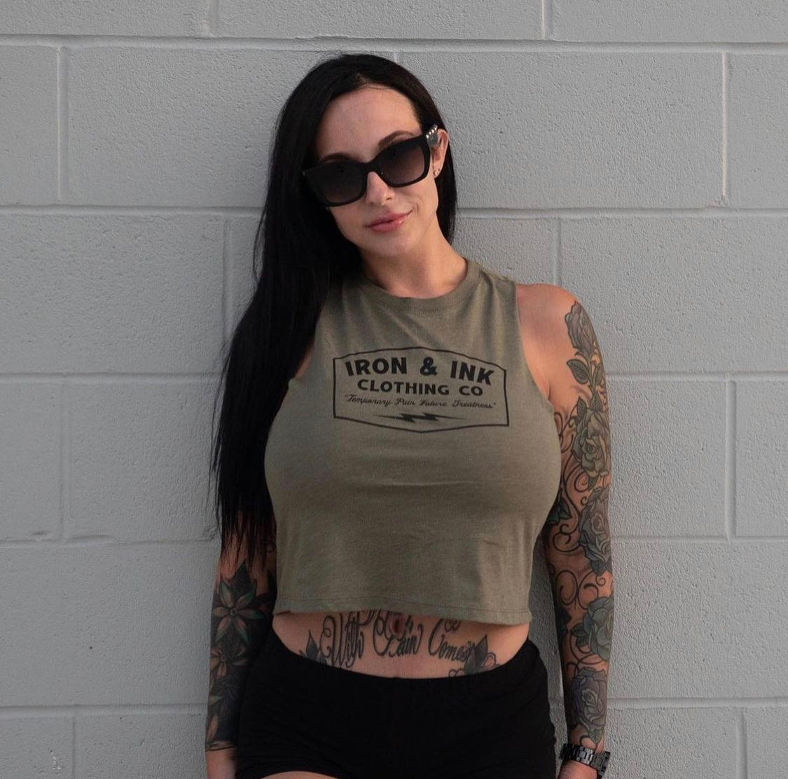 Ladies Future Greatness Racerback Crop Tank Top- Heather Olive Green